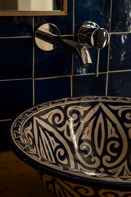 Point de départ du projet, une vasque marocaine, trésor personnel de la cliente, a inspiré un décor unique. Autour d’elle, un zellige aux nuances crème et bleu célèbre la beauté des matières artisanales. La palette affirmée dialogue avec des lignes sobres, dans un intérieur vibrant, sensible et sur mesure.